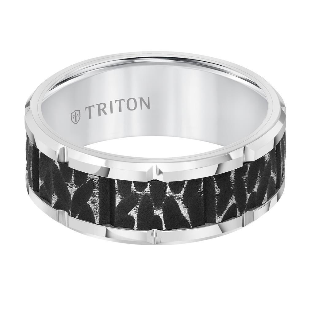 This Triton ring is crafted in durable tungsten carbide and made with a flat profile. The sandblasted black center and polished white edges create a fascinating contrast. The edges and the center are accentuated with cuts for additional detail. This men’s wedding band is offered in a 9mm width. You may find similar ring styles in our grooved wedding bands collection. Tungsten Carbide is the newest and strongest metal to be used in the jewelry market. It’s four times harder than titanium and twice as hard as steel, making it highly scratch resistant. Please note that inlays are made of a softer material than tungsten, therefore, they can scratch. Larson Jewelers is proud to be an authorized dealer of Triton Rings. Triton Rings is one of the most well known and respected designers of tungsten rings in the USA. All of their rings come with a manufacturer's warranty that covers lifetime size exchanges as well as repair or replacement in case of accidental damage. Note: There is a fee charged by Triton Rings, not us, to cover the charge of shipping and handling for all warranty work.