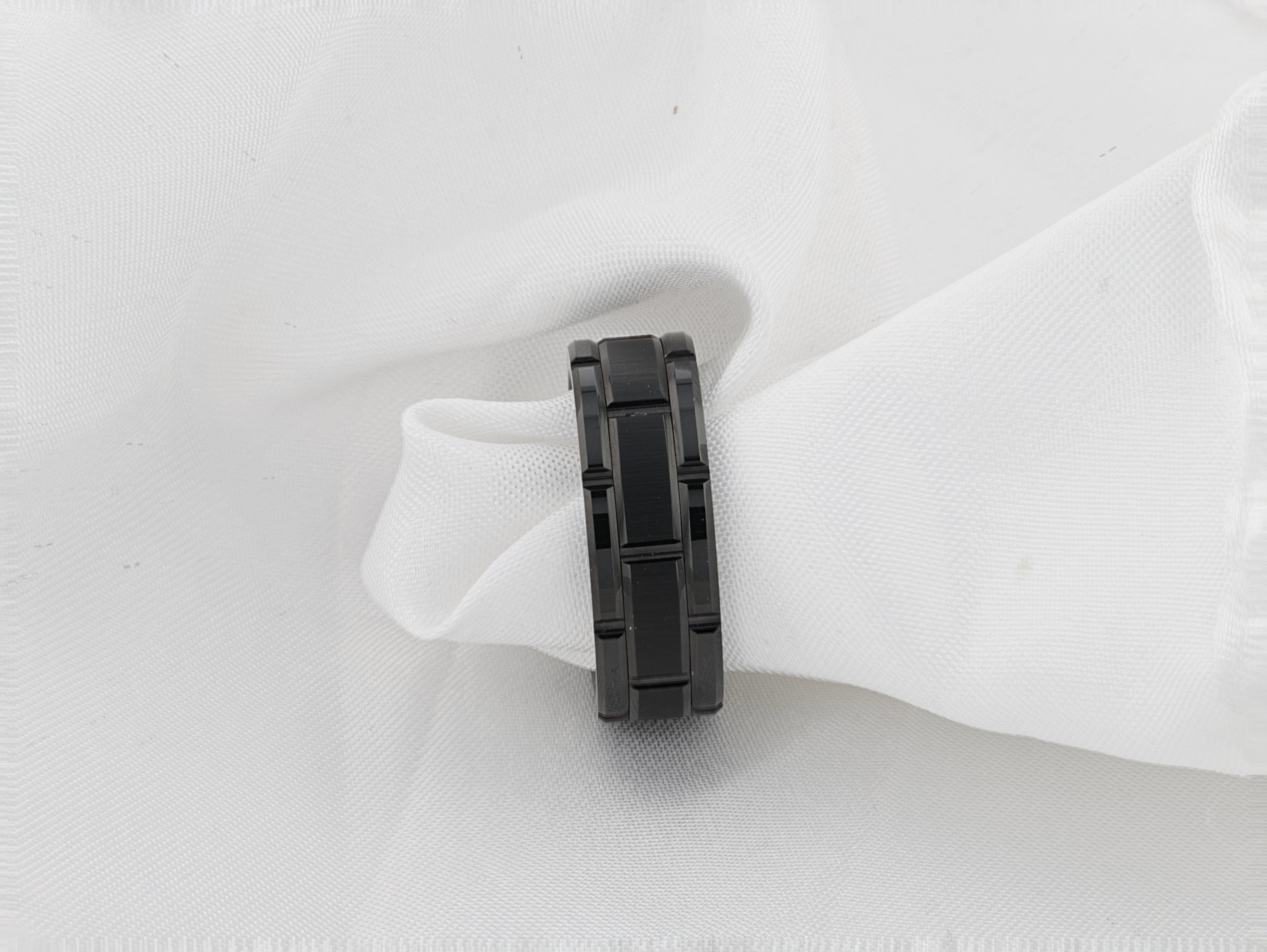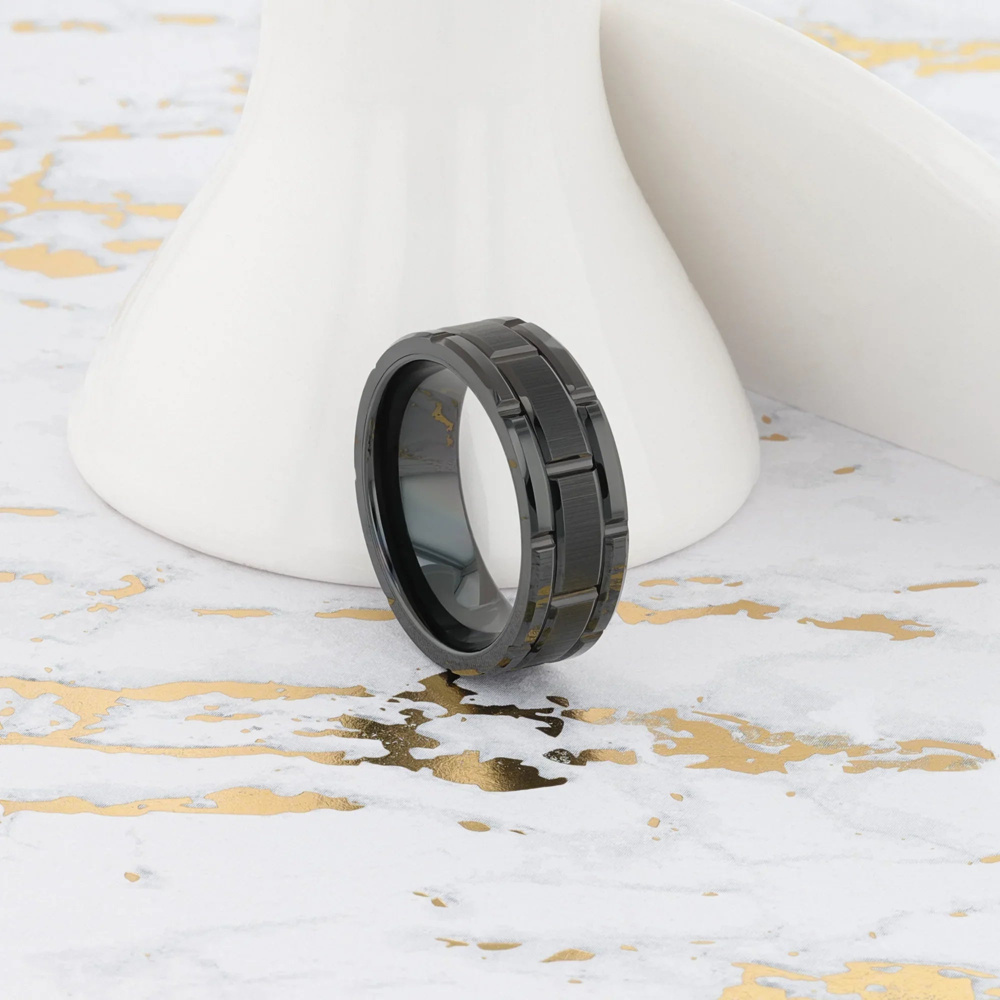 This remarkable, attention-grabbing Black Tungsten Carbide ring design from Thorsten features a beautiful vertically-brushed finish on the center band flanked with carved side band segments with polished beveled edges and can be worn as a wedding band or promise ring.
