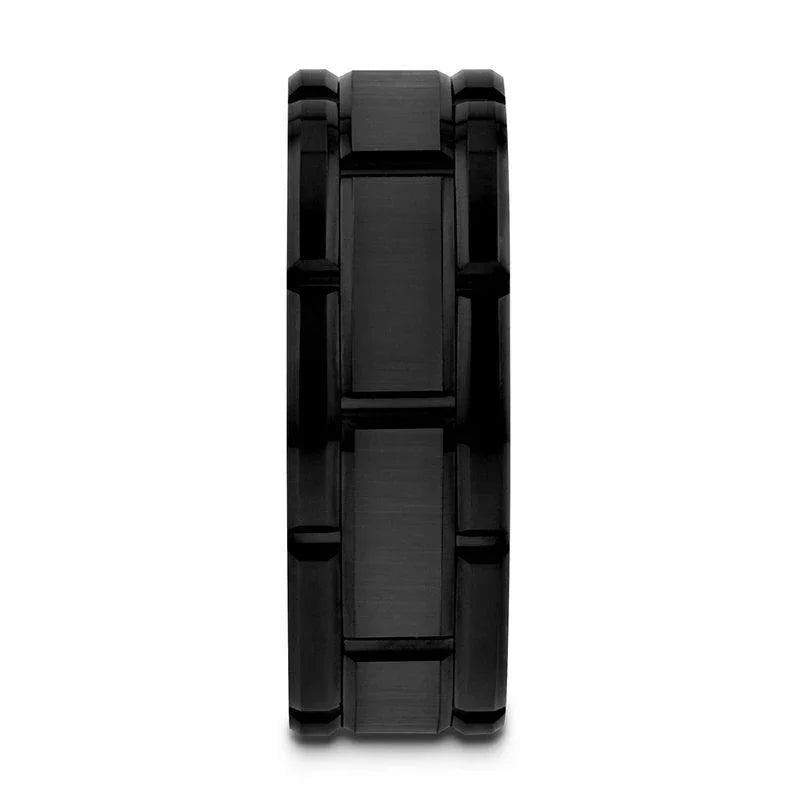 WINDSOR Beveled Black Tungsten Carbide Wedding Band with Brushed Center and Alternating Grooves β 8mm & 10mm