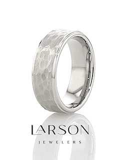 This masculinestyle White Tungsten ring by Thorsten has a raised hammeredfinish center and polished step edges. For couples who want the durability of tungsten with the bright white color of platinum. Our unique bonding process makes the plating more scratchresistant than white gold wedding bands.