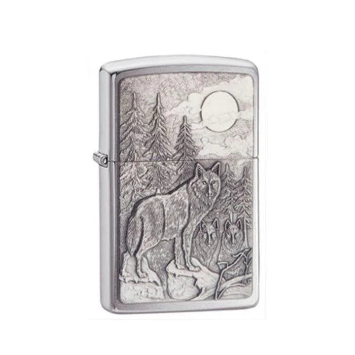 This is a gorgeous zippo lighter with a timberwolf emblem on the front. This is made in the traditional Zippo style. This lighter measures 2 1/4" x 1 7/16". This lighter is fully engraveable with many fonts and symbols to choose from. Zippo lighters are world famous and known for their quality and being fully made in the United States.