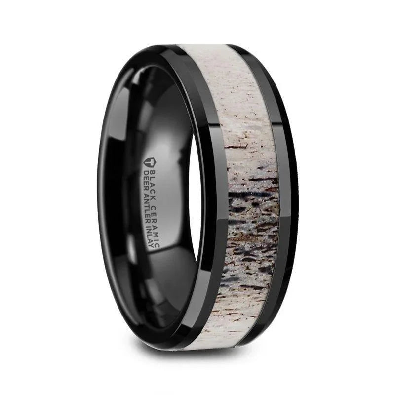 Composed from light and dark brown deer antler inlay, this beautifully polished and beveled ring introduces a subtle design element to the wedding band. This men's wedding band is made from black ceramic, which is one of the most durable, color fade resistant materials out there. It has been skillfully inlaid to feature an impressive cut of deer antler. The center highlights the two white and brown tones, creating an Ombre finish at the center where they meet.Β